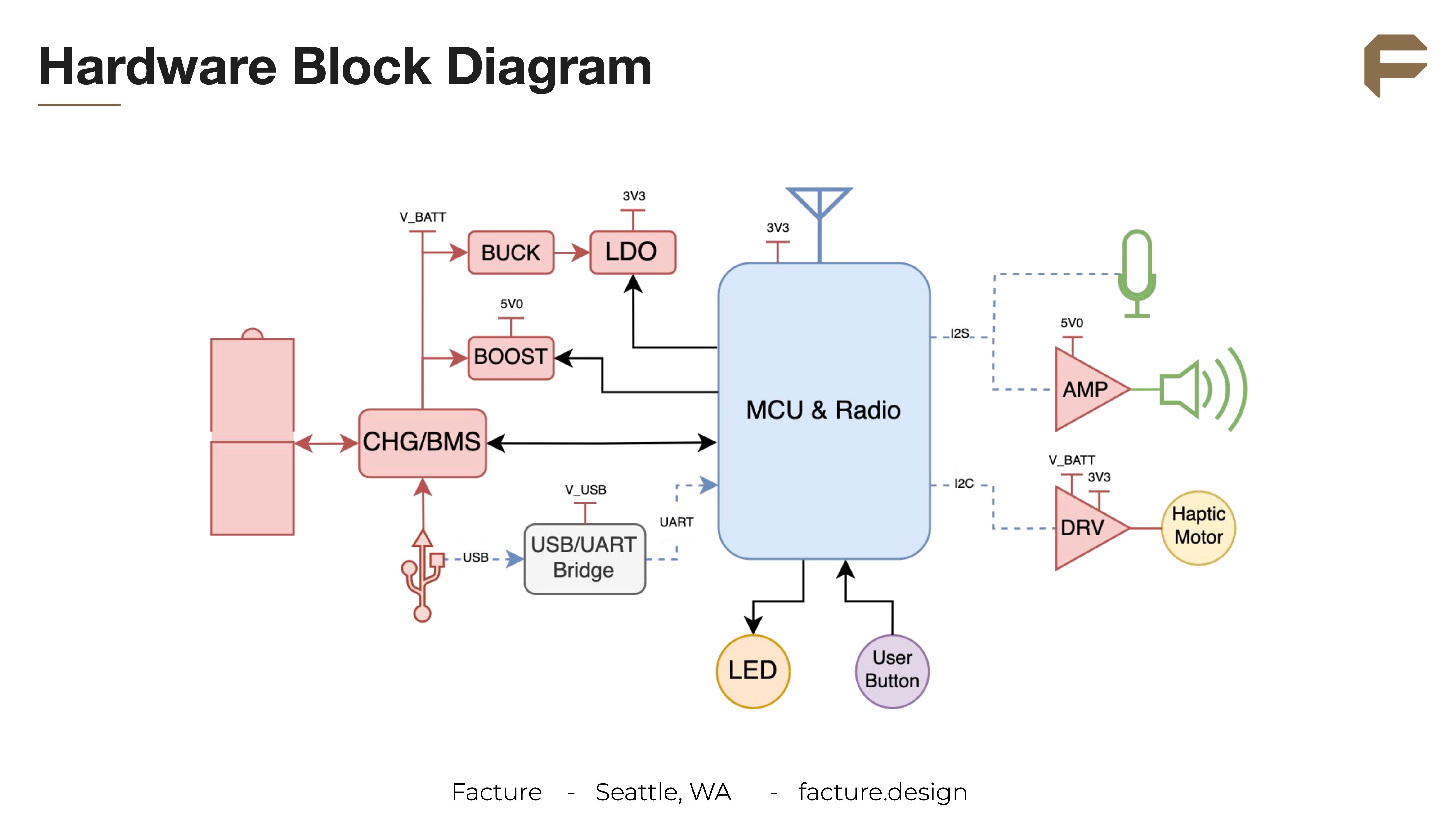 # 01 Light Manufacturing Report ![alt text]() ## Table of Contents - [Introduction](#introduction) - [Product Requirements](#product-requirements) - [Firmware Design](#firmware-design) - [Electrical Design](#electrical-design) - [User Experience + Industrial Design](#user-experience-industrial-design) - [Appendix](#appendix) ## Introduction This report captures the comprehensive work completed through June 2024, including detailed product requirements, product architecture, design thinking, and strategic decisions. Below, you'll find links to essential assets, resources, and documentation that collectively support the development and vision of the O1 Light. Thanks to [Facture](https://facture.design) for the amazing work producing these resources. ## Product Requirements [Project Details]() The Product Requirements Document (PRD) is the north star during development and includes additional information such as success metrics and risks/mitigations. It is critical that this is drafted early on in any project and maintained diligently throughout. Requirements are categorized and utilize priority ranking (P0/P1/P2) to focus on core function, but not forgetting about reach goals or long-term product targets. The following summarize the content that is present in the PRD: ### Product Requirements | # | Feature | Requirement | Priority | Notes | |----|------------------------------|--------------------------------------------------------------------------|----------|-------------------------------------------------------------------------| | 1 | System Requirements | Full device COGs should be <$70, <$45, <$30 | P0, P1, P2| Updated per kickoff | | 2 | Functional Requirements - UX/ID | General size must be around the size of a Glossier You | P1 | | | | | Thumbprint indentation on top of the case | P0 | | | | | Silicon wrapper/skin around the main mechanical enclosure | P1 | To be determined upon manufacturing vendor clarifying information | | | | Silicone wrapper surface should be pleasant to hold | P1 | STEM Player as inspiration | | | | Thumbprint size and orientation must cater to appropriate device orientation | P0 | | | | | Device case must fit comfortably within the vast majority of consumers' hands | P0 | | | | | Users must be able to easily access and plug in a USB C cord to charge | P0 | | | | | Tactile button to engage voice transmission | P0 | | | | | Haptic vibration must be detectable to user while in hand and pocket | P1 | | | | | LED must be perceivable to user in daylight | P2 | May or may not be included in the device | | 3 | Functional Requirements - Mechanical | No larger than <55 x 55 x 38> mm | P0 | No larger than current prototype | | | | No heavier than <50> g | P2 | Baseline of an AirPods case - open for discussion | | | | All component parts shall be located and secured to avoid chatter | P0 | | | | | Pad printing shall meet the requirements of Abrasion and Adhesion | P1 | Should this be branded? | | | | Date of manufacture marking on the exterior of the housing | P1 | Indelible and uniquely identified | | | | PROTOTYPE – not for resale | P1 | | | 4 | Functional Requirements - Electrical | Device shall be capable of communicating with server via Bluetooth | P0 | | | | | Device shall be capable of communicating with server via Wifi | P1 | | | | | Audio output should be clear and discernible from an arm’s length away | P0 | | | | | Device shall be audible from 12-18" away in quiet environment | P1 | User is expected to need to bring device closer in noisy environments | | | | Speaker driver shall be capable of delivering at least xx Watts of power | P0 | 01 Light has 2.5W speaker driver but no listed speaker | | | | Speaker driver must have no more than xx % THD | P0 | | | | | Shall be capable of producing an acoustic sound pressure level (SPL) of at least xx dB at 10 cm | P0 | | | | | Microphone shall have SNR of at least 61.5 dB(A) | P0 | Driven from 01 Light components | | | | Microphone shall have sensitivity of at least -19 dBFS (94dB SPL @ 1 kHz)| P0 | Driven from 01 Light components | | | | Tactile pushbutton shall have an operating force of at least xx gf | P1 | | | | | Battery should provide at least 4 hours of active Bluetooth use | P0 | | | | | Battery should provide at least 2 hours of active WiFi use | P0 | | | | | Device should provide haptic feedback to user | P1 | | | | | User must be able to charge battery via USB-C port | P0 | | | | | Installing FW updates should be possible via USB-C port | P1 | | | | | Device may contain LED to indicate status of charge | n/a | Client expects one more discussion (with Killian included) about this | | | | Device may leverage Bluetooth headset for speaker and microphone | P2 | | | 5 | Functional Requirements - Firmware | Device shall disable WiFi when Bluetooth is used | P2 | ESP supports simultaneous connections, however, device should have capabilities of turning the unused or lower speed connection off to conserve power. | | | | Microphone shall never be enabled unless pushbutton is pressed | P0 | | | | | Device shall deliver unique tones and/or vibration to alert user of low power and fully charged states | P1 | Specific UX alert requirements TBD | | | | User should be able to turn the device ON/OFF by quickly pressing the pushbutton 3 times | P1 | quickly needs more definition | | | | Device should be capable of simultaneous charging and operation | P1 | | | | | Security of data transfer shall be considered only after all P0 items are complete | P1 | | | 6 | Functional Requirements - Software | | n/a | | | 7 | Environmental Requirements | Ambient temperatures of <-15°C, 45°C> | P0 | | | | | Ambient temperatures of <-30°C, 50°C> | P0 | | | | | Ambient relative humidity of <10%, 90%> | P0 | | | | | Ambient relative humidity of <10%, 90%> | P0 | | | | | 0 to 10,000 feet steady-state | P0 | | | | | Airplane transit – Pressure change of 0 ft to 8,000 ft (2 hr dwell) to 0 ft with a ramp rate of 250 ft/min | P0 | 